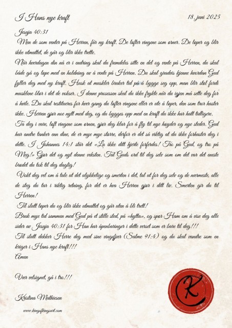 Ta deg i vare, løft vingene som ørnen, gjør deg klar for å fly til nye høyder og nye steder. Gud har andre tanker enn dine, de er mye mye større, derfor er det så viktig at du ikke forhaster deg i dette. I Johannes 14:1 står det «La ikke ditt hjerte forferdes! Tro på Gud, og tro på Meg!» Gjør det og nyt denne veksten. Tal Guds ord til deg selv som om det var det eneste brødet du tok til deg daglig!