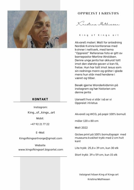 Giclee trykk/kunst trykk: All kunst fra King of Kings art er trykket på 300 grams 100% bomullspapir hvis ikke annet er oppgitt. Blekket som brukes har museumskvalitet. Dette vil si at fargene er av beste og høyeste kvalitet, og taper ikke intensitet før om 80-100 år. Alle giclee trykk er signert og nummerert i et begrenset opplag.