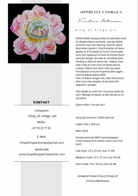 Dette bilde så jeg under en periode i bønn og faste. Jeg opplever at Gud viser meg sin omsorg som Han har for alle de ufødte barn som av en eller annen grunn ikke ble født til et liv på jorden. Han viser en ømhet og kjærlighet for alle disse foreldrene og et håp om å møte barnet sitt igjen, hjemme hos Herren. De vil kjenne barnet sitt igjen fordi det bærer foreldrenes dna. Han viste meg barnet som vokser videre hos Ham. Da ser jeg dette fosteret som lever i denne blomsten og blir født hjemme i himmelen. Herren hvisker med iver at Han er der med deg, Han ønsker å bære smerten din så DU kan stå oppreist i sorgen.