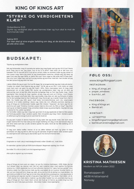 I dette tilfelle får jeg et spm fra Gud få dager før arrangementet jeg skal male på starter. "Husker du reisen med klærne jeg ga deg?" Så får jeg se en film i mitt indre, en reise med Ham som var gjort fra jeg ble frelst i 2014. Flere mennesker kom til meg med bibelverset om at jeg hadde fått styrke og verdighetens klær! Jeg var så stolt og takknemlig over at jeg fikk slike levende kongelige klær av Far! Jeg frydet meg i Hans kjærlighet. Men da jeg så meg i speilen, så jeg meg selv som en 5 åring i mors fineste kåpe, den passet overhode ikke. Men jeg brydde meg ikke om det og fortsatte å takke Far for de nydelige klærne Han hadde gitt meg. Årene går og vi spoler langt frem, helt til 2022. Da hadde jeg blitt spurt med årets kvinnekonferanse som (ny utsprunget) kunstner til å holde utstilling i deres regi. Dette ble min offisielle premiere åpning av King of Kings art. Konferansen hadde også fått tittelen "Oppreist", da hører jeg Far sin stemme som spør "Kristina, hvordan passer klærne dine som du fikk av Meg?" Jeg titter ned og ser at klærne passer meg utmerket, både kropp og personlighet. Jeg kjenner jeg vil danse for Far, jubler og takker.