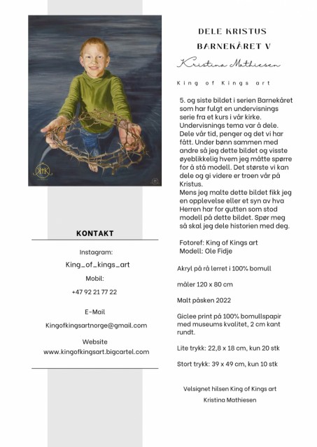 siste bildet skulle handle om å dele, dele det vi har, dele tid, penger og kunnskap. Tiden var knapp og motivet var ikke klart. Tanker rundt tema var flere barn som fikk tildelt tornekronen. Men jo flere portretter i et maleri, dess lengre tid å male, og tid hadde jeg lite av. Igjen kommer desperasjonen og kjente at svar kunne jeg bare få i bønn, og jeg ville be sammen med andre, så ikke rastløsheten tok meg i den ringe begynnelse, ikke at andre kunne si hva som skulle være motivet men ønsket et klart signal fra Herren.