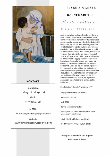 Lerret og farger var kjøpt spesielt inn til det valgte motivet. Hun satt konsentrert og skrev andakten til bildet, men hennes tanker kvernet rundt og et motiv av mor Teresa svevde i hodet hennes. Mor Teresa er et verdens ikon på å elske sin neste. Hun prøvde strengt å irettesette tankene sine med logikk av at det var kort tid til å male og man må ha en bestemt lisens for å få lov å male henne. Det må bestilles og betales for, samt at Mathiesen ikke var så kjent med historien til Mor Teresa. Hun kjente ikke en eneste historie. Mens hun skriver andakten piper det i mobilen. På vei til ateliet for å starte på maleriet ser hun at en kjenning har sendt henne en video på instagram, hun åpner den og det var en kort video av en pastor som forteller en vakker historie fra Mor Teresa sitt liv. Mathiesen opplevde dette som klart tale fra Gud. Hun kastet seg rundt og fikk ordnet både lisens og betaling på kort tid. En ting er viktigere enn noe annet i Mathiesen sitt kall og det er lydighet!
