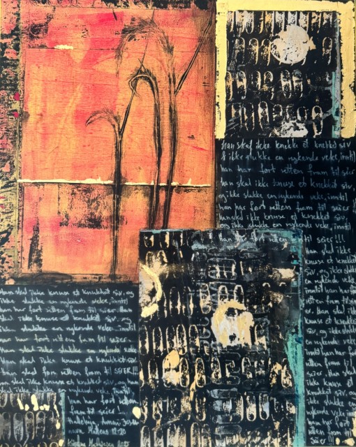 Abstrakt verk, mixed media. Verket er dekket med resin, som et topplag over kunsten. Det gir en fløyelsglatt overflate som skiller seg ut. Les budskapet til verket nedenfor.