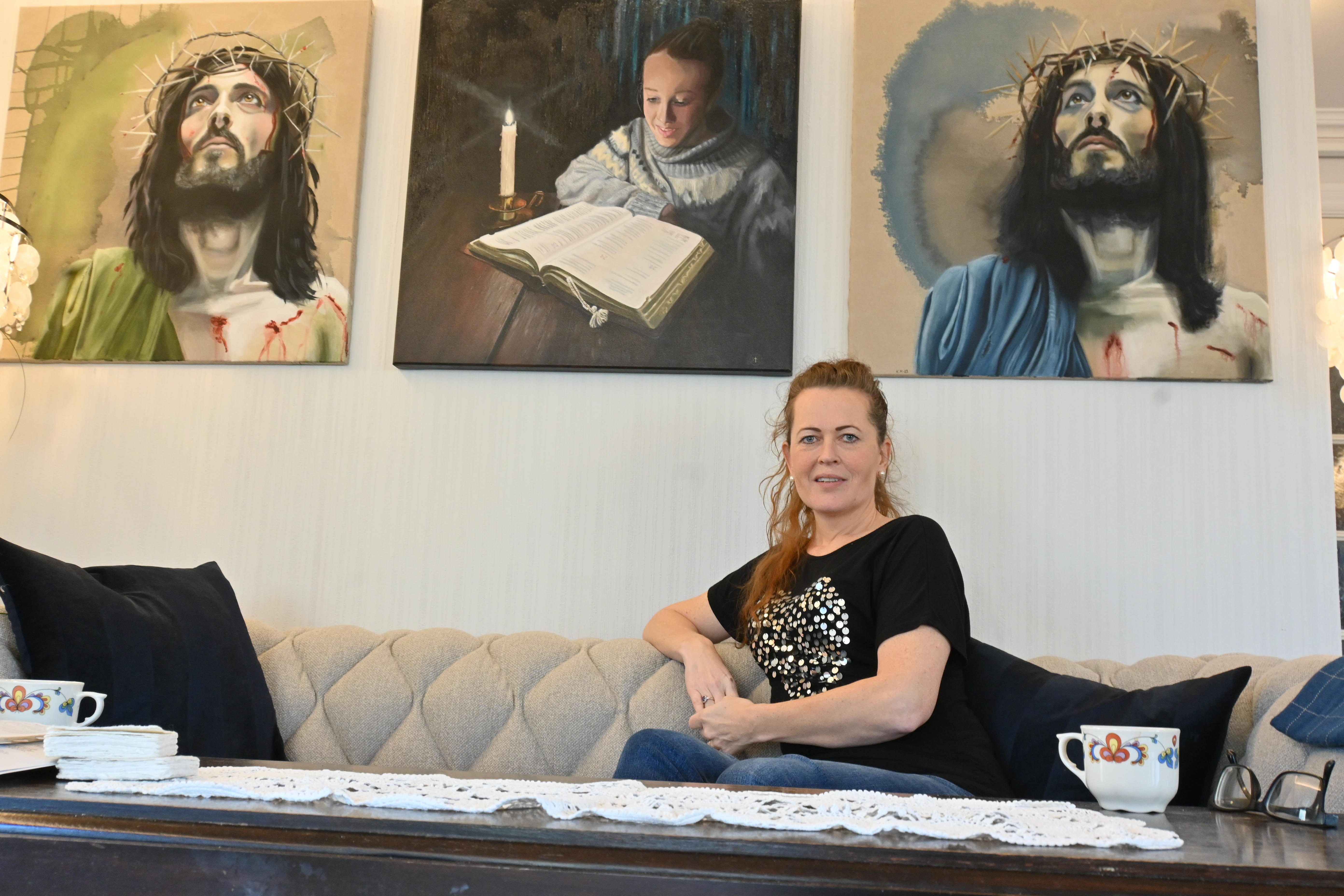 Her står Kristina inne i utsalgsrommet i galleriet. Viser fram sin første tolkning a Jesus som heter "The Moment" Det er fotograf og journalist Espen Sand, fra Lindesnes avis som tok bildet i 2024 under et intervju. Hvis du ser opp i høyre del av fotoet ser du et annet maleri av Jesus titte inn glassdøren.