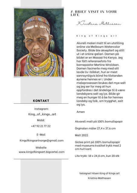 Har du et kall over deg til misjon i Afrika, nå de unådde eller kanskje direkte til Kenya og Maasai folket? Dette vakre verket taler de ord om misjon, nå mennesker med evangeliet, se de Han ser, bli kjent og bygge en relasjon selv om det kanskje bare er en kort tid, noen år. Men legg igjen en livslang relasjon med Jesus hos de du møter.